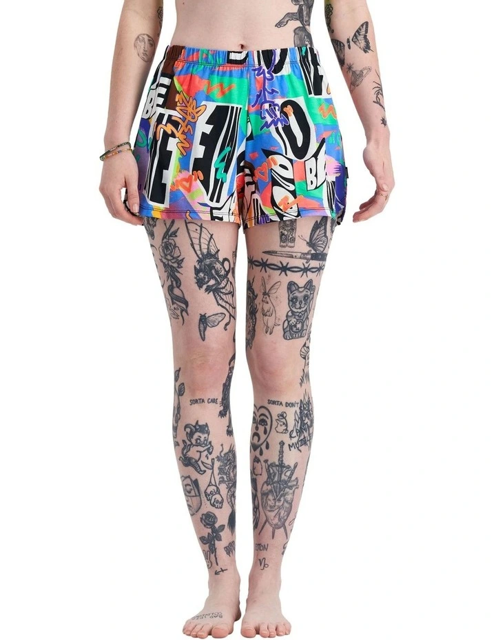 - Pride sleep shorts with a gorgeous pop-colour custom design by queer artist Kris Andrew Small