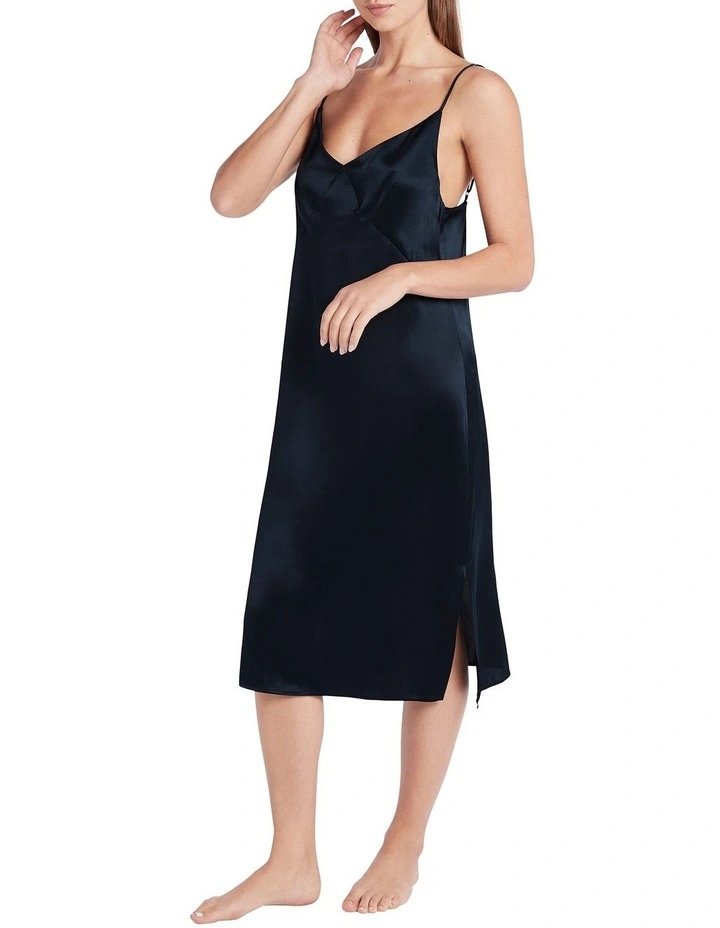 So sumptuously soft youll want to stay in bed all day, this sleep dress skims over the skin in pure silk, as it reveals glossy depths of midnight blue. Flaunting flattering panel shaping at the chest, the sleep dress drapes through a straight silhouette to midi length, completed by adjustable spaghetti straps at the shoulder and splits at the side seam hem.