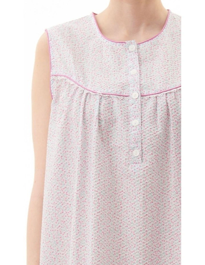 Fresh and summery pink floral print in easy care polyester cotton seersucker, this sleeveless nightie is perfect for summer. The curved front yoke is trimmed with fine lace and satin piping which also edges the armhole and neckline. The skirt of the nightie is gathered onto the front and back yokes allowing for extra comfort. Yana print short, sleeveless nightie sits just below the knee, add the matching brunchcoat to create a fresh, crisp summer set.